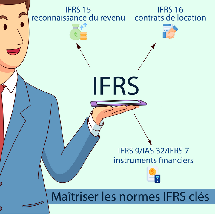 Maîtriser les normes IFRS clés : IFRS 15 (reconnaissance du revenu), IFRS 16 (contrats de location) et IFRS 9/IAS 32/IFRS 7 (instruments financiers).